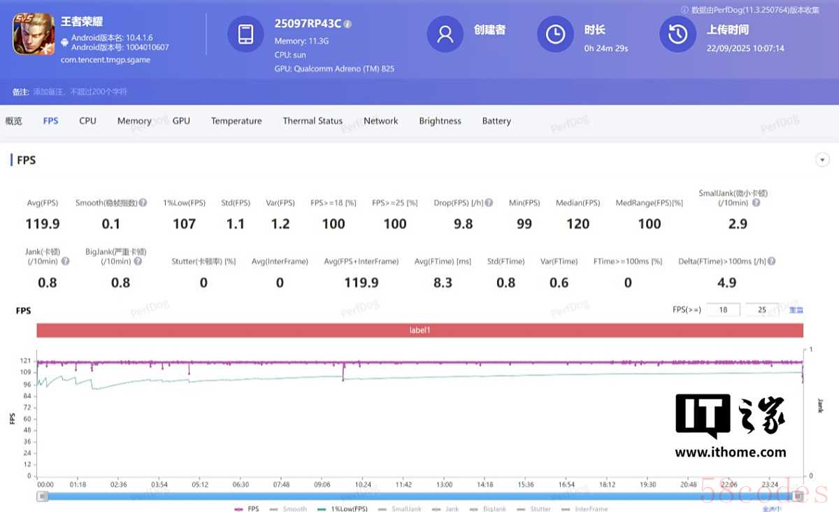 至于游戏表现,我们也对《王者荣耀》这款游戏进行了测试。在室温 25℃的室内环境下,连接 Wi-Fi 来一局匹配,画面总质量选择「极致」,帧率选择「极高」,分辨率选择「超高」。经过 25 分钟游戏后,PerfDog(性能狗)的帧率曲线非常平稳,最终游戏平均帧数为 119.9 帧,1% Low 帧也达到了 107 帧。