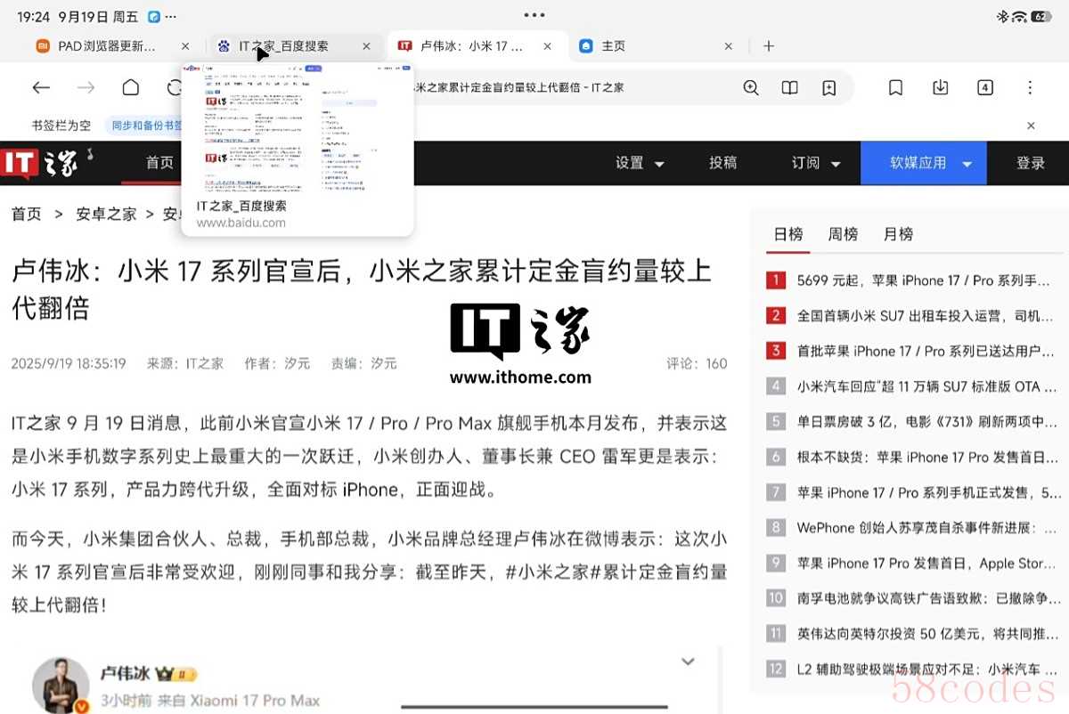澎湃OS 3 系统这次还对浏览器应用进行重做,直接对齐 PC 版功能,让 Pad 版浏览器也能像 PC 一般浏览网页。