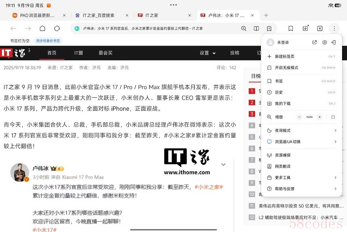 小米平板 8 浏览器支持 PC 级功能菜单,如网页缩放、浏览器 UA 切换等