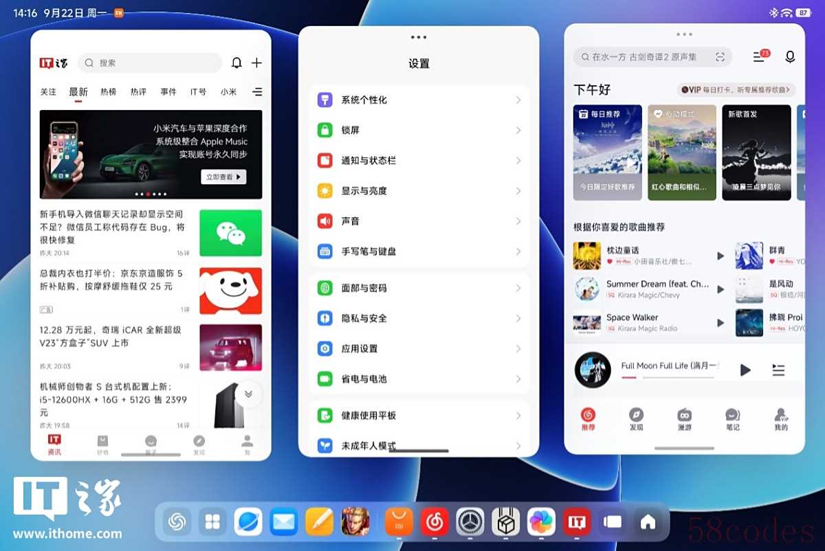 用户也可以在竖屏使用平板时,开启上下两个面积相同的应用分屏,相比横向 5:5 分屏不仅能够完整展示两个应用的内容,还可以在下分屏应用中专注于交互操作,如记笔记、绘画、游戏等,上分屏应用则专注于获取信息,无需频繁切换操作,如展示资料、小红书笔记、视频游戏攻略等内容,一心也能二用。
