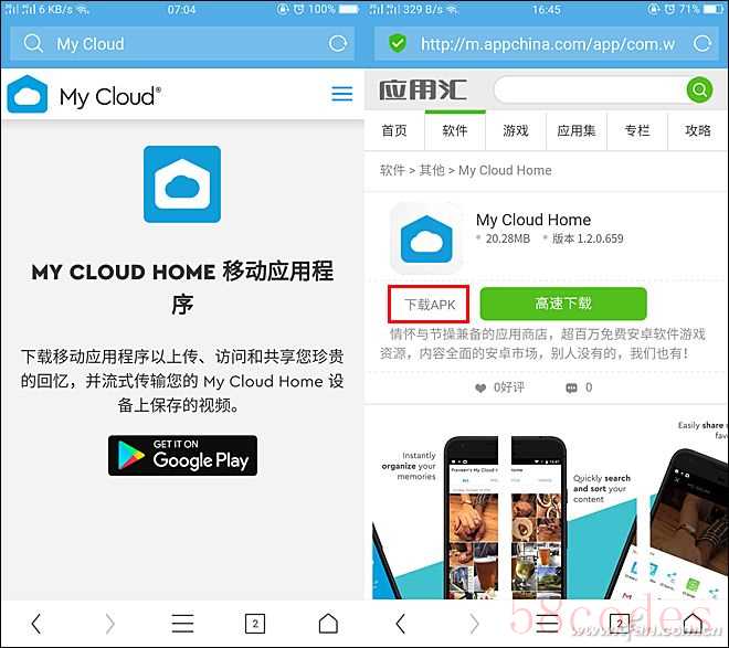 可惜的是,西部数据似乎不太了解国内Android手机用户的习惯,官网仅提供谷歌商店的下载方式。问题是,谷歌服务国内受限,普通用户根本无缘访问,而国产手机应用商店对My Cloud APP的收录并不理想。小编找了半天才在应用汇找到下载地址,下载时大家还需小心别点“高速下载”(这是大坑),需要点击旁边不明显的“下载APK”。