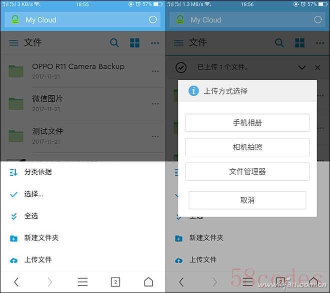 在浏览器端选择上传文件会出现“文件管理器”的选项,点击它就能将手机上任意内容上传进My Cloud Home里面了。
