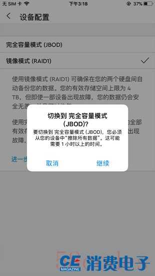 用户如果想要使用完全容量模式(JBOD),即全部利用8TB的磁盘空间,可以在网页内或者App内进行操作。但要注意,切换模式将会删除所有数据,切换时间视数据容量而定。