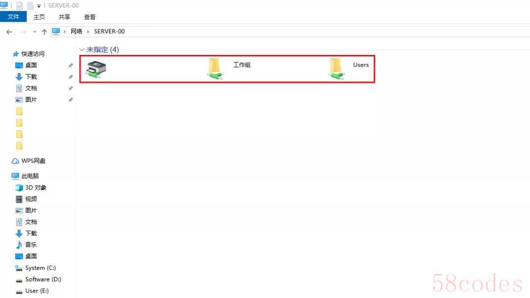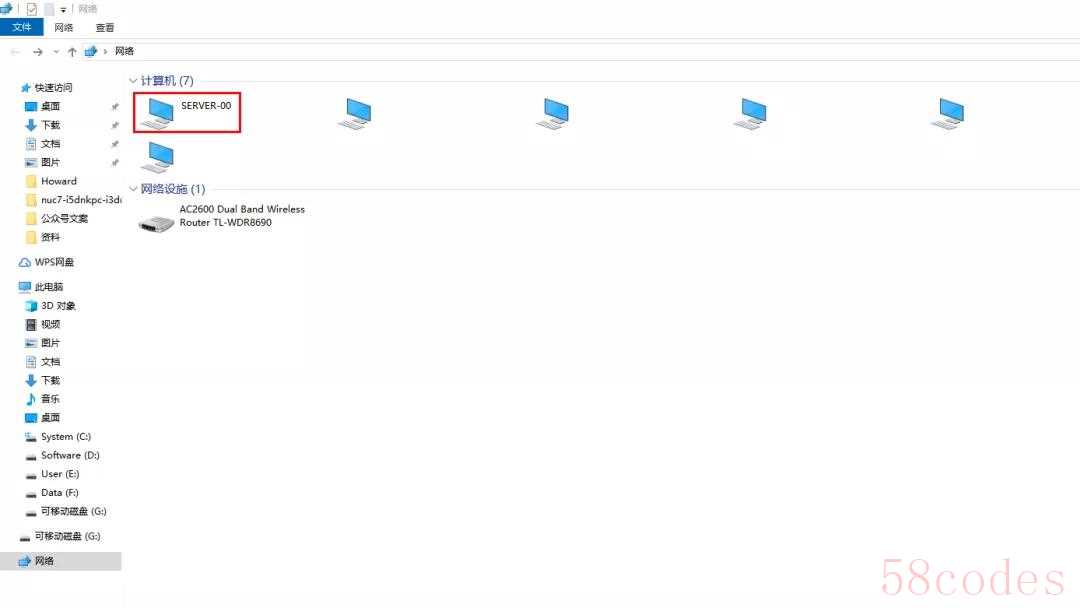 双击打开“网络”,找到设置好共享的“道森峡谷”并双击打开,需要注意的是,这里显示的名字为被共享电脑的“计算机名”,为了方便查找可重命名,纳客这里命名为:“SERVER-00”,双击选择后就可以看到共享的文件夹和打印机了。