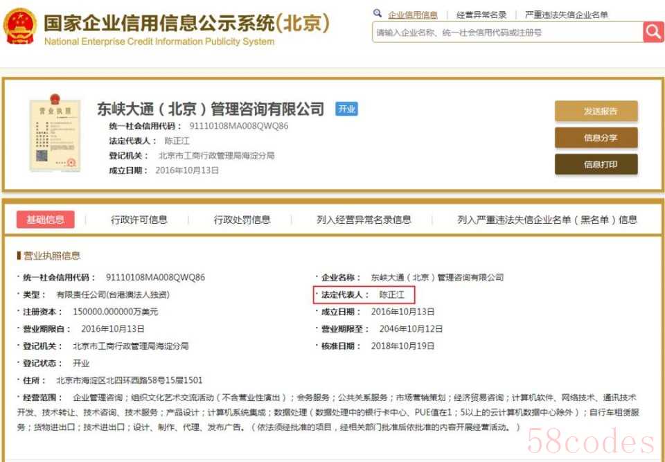 国家企业信用信息公示系统显示,东峡大通(北京)管理咨询有限公司法定代表人10月19日核准变更为陈正江。对此,小黄车表示,法定代表人的变更仅是ofo内部正常的人事变动,公司的实际控制人仍为戴威。