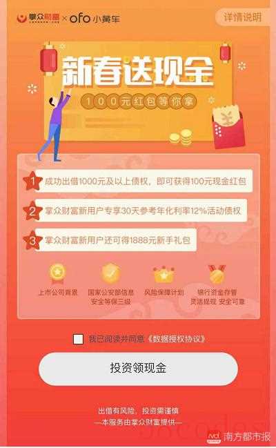 3月3日,南都记者打开ofo的“钱包”,可发现有一个名为“领100元现金,可立即提现到支付宝”的活动。点进去,记者发现这是“掌众财富”与“ofo小黄车”合作的理财项目。页面介绍,“成功出借1000元及以上债权,即可获得100元现金红包;掌众财富用户专享30天参考年化利率12%活动债权;掌众财富新用户还可得1888新手礼包”。