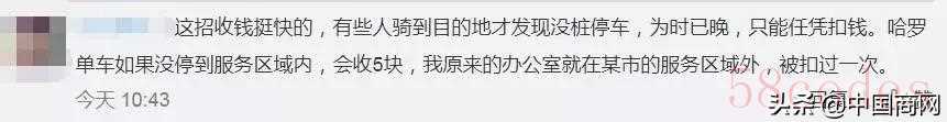 还有网友分享经验:这招收钱挺快的,有些人骑到目的地才发现没桩停车,为时已晚,只能任凭扣钱。哈罗单车如果没停到服务区域内,会收5块,我原来的办公室就在某市的服务区域外,被扣过一次。