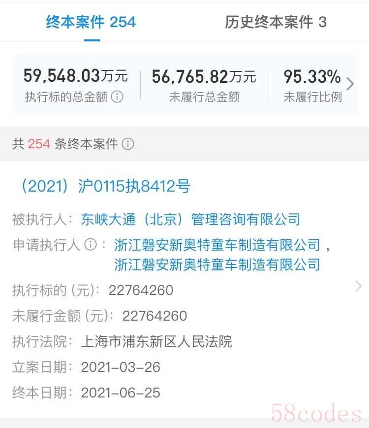 在“某企业信息查询平台”搜索可见,截至今年7月6日,ofo运营主体东峡大通320余次列被为被执行人,40余次被列为失信被执行人。254条终本案件(指对确无财产可供执行的案件,法院进行暂时终结执行程序并做结案处理,待发现财产后继续恢复执行)中,执行标的总金额近6亿元,未履行比例约96%。