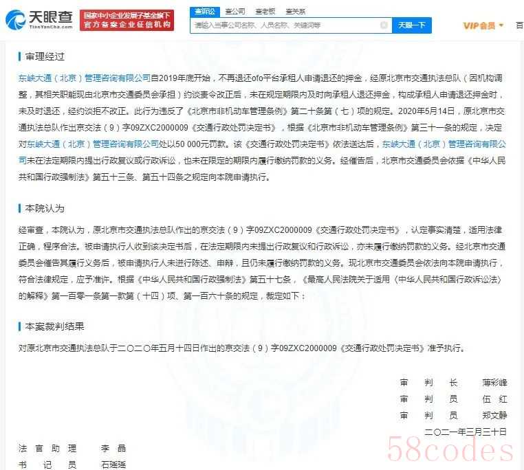 该判决内容显示,2020年,ofo公司被有关部门约谈责令改正后,仍未及时退还承租人押金。如今,法院判决强制执行ofo公司5万元罚款。