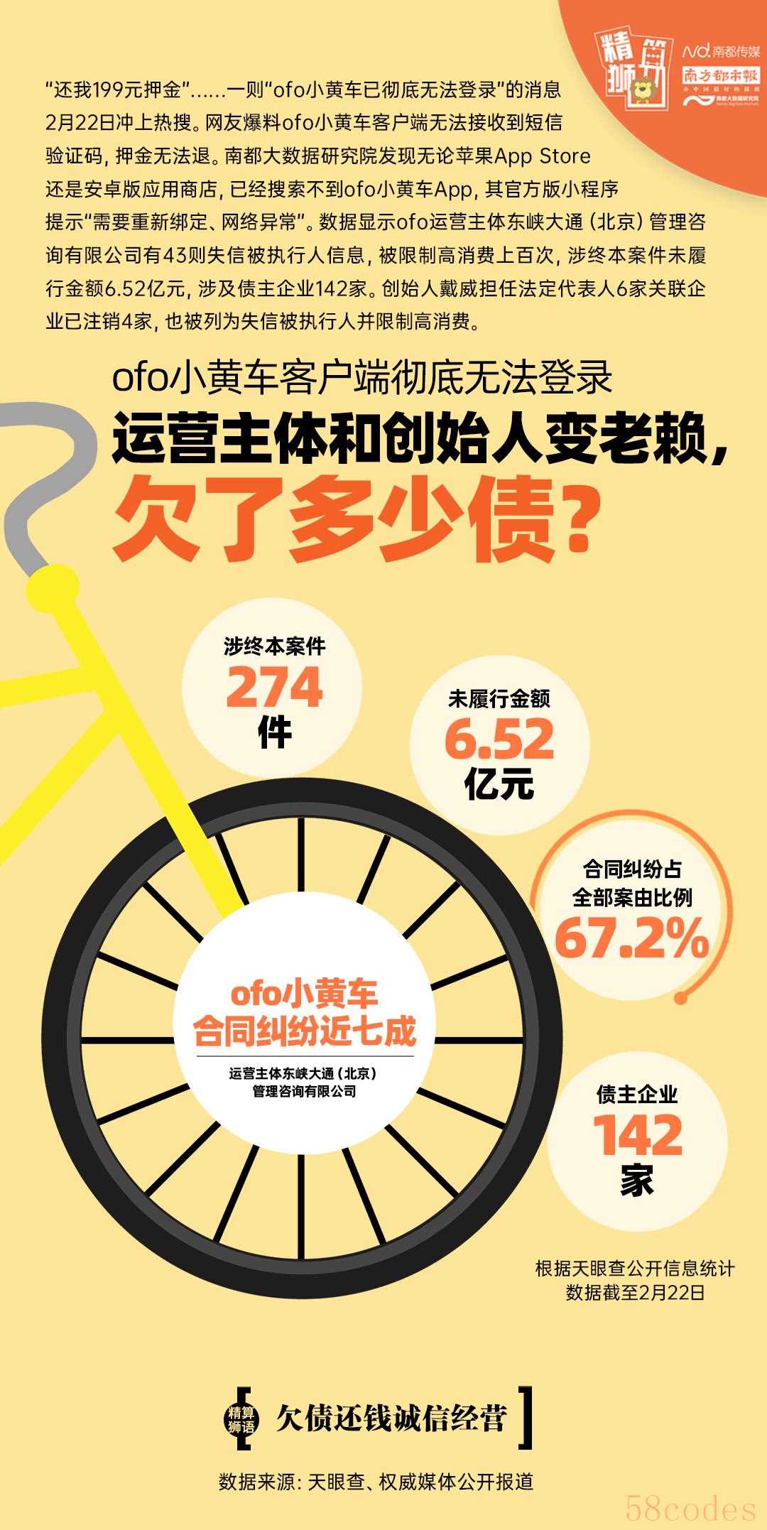 梳理数据显示,ofo运营主体东峡大通(北京)管理咨询有限公司有43则失信被执行人信息,被限制高消费上百次,涉终本案件274件,未履行金额高达6.52亿元,至少涉及142家债主企业。ofo创始人戴威担任法定代表人的6家关联企业已注销4家,也被列为失信被执行人并限制高消费。