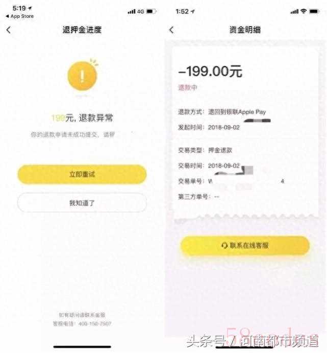 ofo用户杨先生表示,近期对账户上的押金申请退还处理后,却显示“退款异常”。据资金明细中显示,退款方式退回原支付渠道“银联Apple Pay”。