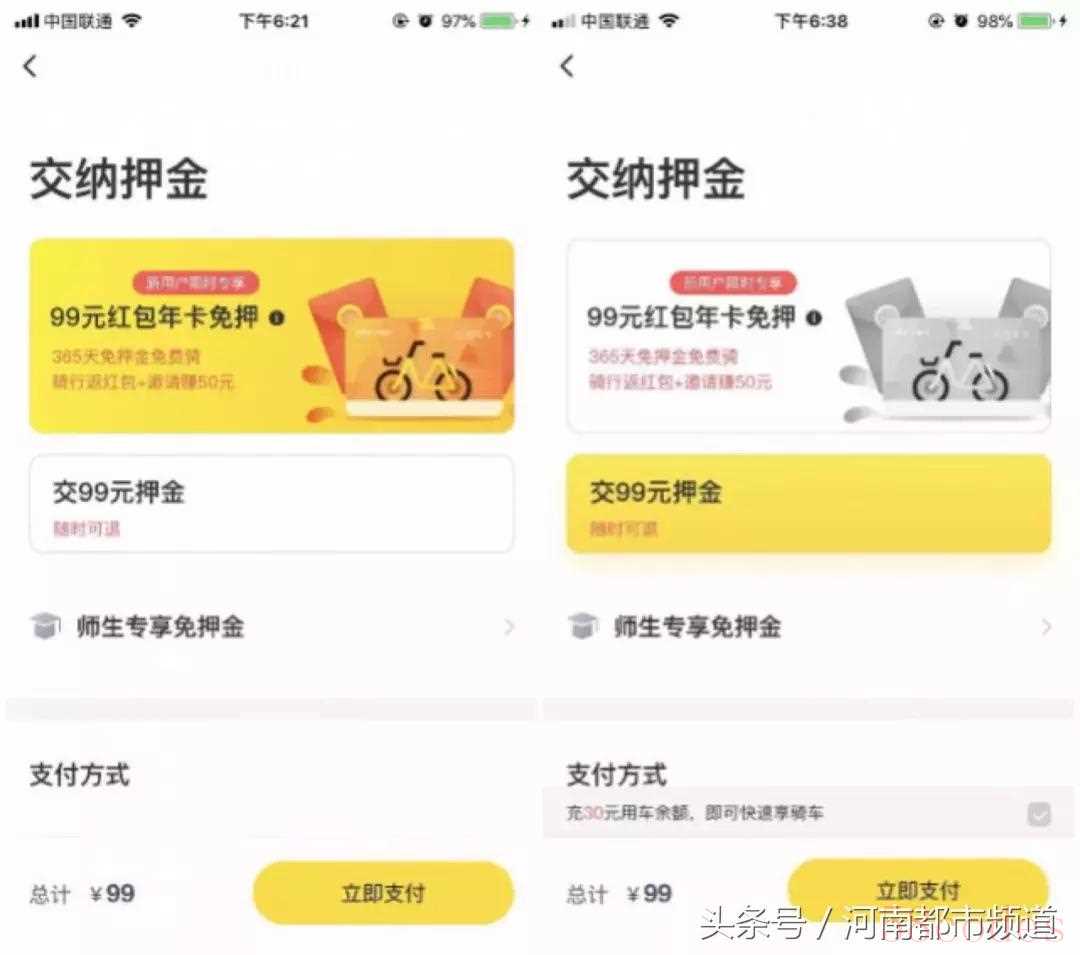 注册新用户选择骑行时,系统提示用户尚未缴纳押金。跳转页面之后,系统默认选项为“99元红包年卡免押”,如果按照默认选项支付成功,用户相当于购买了一张可免押骑行的年卡,而非充值押金。