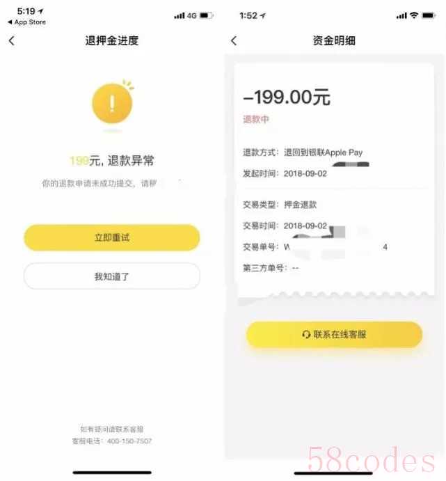 ofo用户杨先生表示,近期对账户上的押金申请退还处理后,却显示“退款异常”。据资金明细中显示,退款方式退回原支付渠道“银联Apple Pay”。