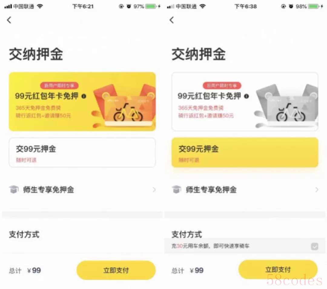 注册新用户选择骑行时,系统提示用户尚未缴纳押金。跳转页面之后,系统默认选项为“99元红包年卡免押”,如果按照默认选项支付成功,用户相当于购买了一张可免押骑行的年卡,而非充值押金。