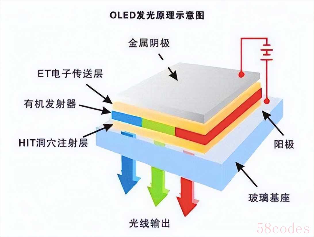 2. 发光原理:有机分子的电致发光:OLED 的发光过程基于 “电致发光” 效应,简单来说就是通电后有机分子发光,具体可以分为四个阶段:首先载流子注入:在屏幕的阳极(透明导电层,常用材料是 ITO)和阴极(金属层,比如铝、镁银合金)之间加上电压后,阳极会注入带正电的空穴,阴极会注入带负电的电子;其次载流子传输:空穴会通过 “空穴传输层”(HTL,比如 TPD 材料)向发光层移动,电子则通过 “电子传输层”(ETL,比如 Alq₃材料)向发光层移动;然后激子形成:在发光层里,电子和空穴相遇并结合,形成 “激子”(处于激发态的电子 - 空穴对);最后光子发射:激子从激发态回到基态时,会把能量以光子的形式释放出来。不同结构的有机分子,对应的跃迁能量不同,所以能发出不同颜色的光。