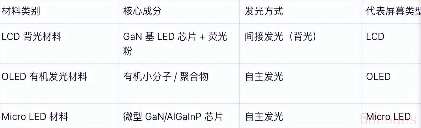 手机屏幕是我们日常使用手机时交互最频繁的部分,屏幕显示效果的好坏,背后离不开发光材料的支撑。目前,手机屏幕主流的发光材料主要分为三大类,分别是LCD 屏幕专用的背光材料、OLED 屏幕核心的有机发光材料,以及近年来逐渐兴起的Micro LED 屏幕无机发光材料。这三类材料在成分、结构和发光原理上差异明显,而这些差异直接决定了屏幕的亮度高低、对比度强弱、耗电量多少以及使用寿命长短等关键性能。