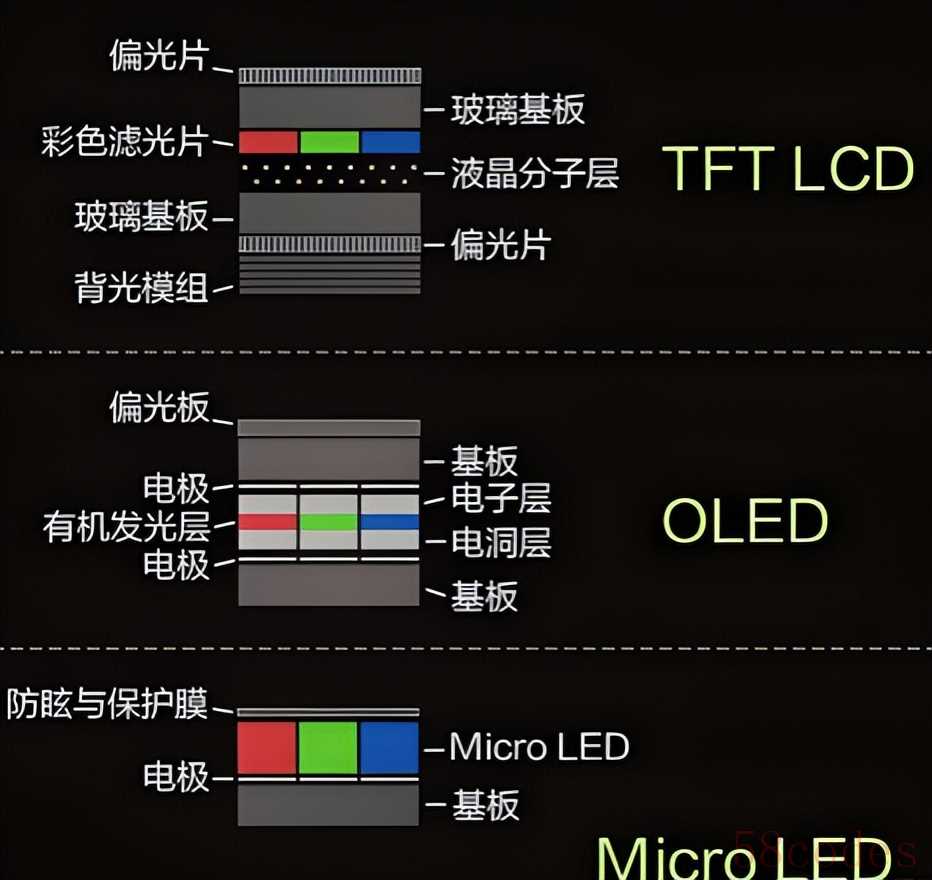 功耗更低:因为不需要发光层之外的传输层和封装结构,能量损耗更少,在相同亮度下,Micro LED 的功耗比 OLED 低 30% 以上。
