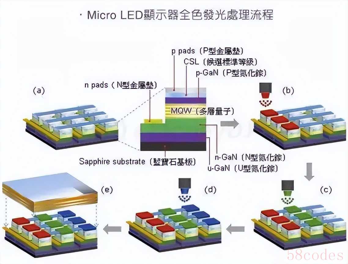 蓝色和绿色 Micro LED:直接采用 InGaN/GaN 量子阱结构,通过调整铟(In)的含量来控制光的波长 —— 蓝光的波长约为 450nm,绿光约为 520nm;