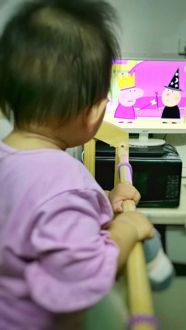 小花生喜欢听节奏性比较强的儿歌。有一次,我给她播放《两只老虎》视频。她看着视频里老虎的画面,同时听着《两只老虎》的儿歌,她一下子知道了儿歌里的“老虎”是什么了。还有一次,我偶然打开《小猪佩奇》,没想到一下子就吸引了小花生的注意力。她虽然看不懂,但卡通动物的鲜艳颜色、可爱形象以及会动的小动物,都能让她驻足观看。家里也有小猪佩奇和小猪乔治的玩偶,我会让小花生在看动画片时,把两个小玩偶放在她面前,这样她就能把玩偶和动画片联系起来了。在保证视力健康的前提下,我们并没有限制她看电视。