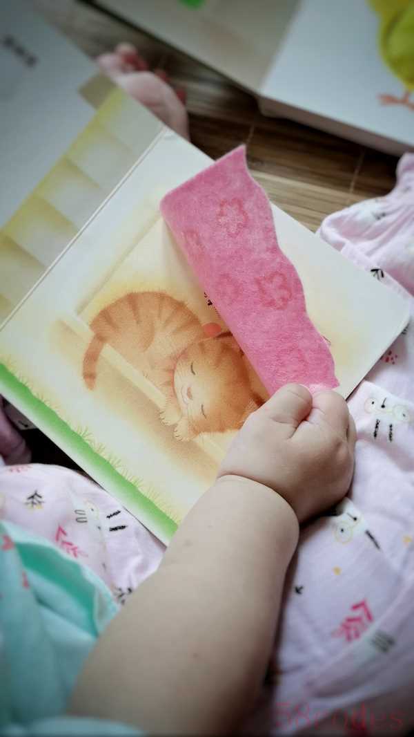 大多数时候,猫会主动靠近我们,只是有点怕小花生,因为它会被小花生使劲儿揪住尾巴、动弹不得。家里的猫其实每年有做健康检查,性格也挺温顺。但我们担心猫会在被揪疼的情况下,咬伤小花生以“逃脱”。所以我会让小花生读动物触感玩具书,以满足她对小动物的亲近欲望。她喜欢摸书本里头小猫毛茸茸的肚子里。相比去“揪”小猫的毛,这种代替方式会更加安全。我想正是因为有了bong bong存在,小花生才会在读绘本的时候,会特别喜欢小动物。