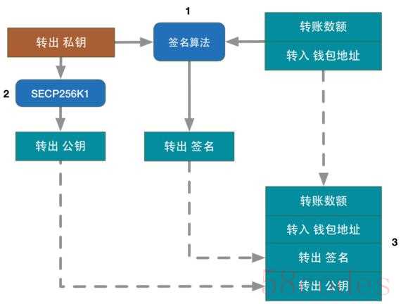 交易数据被广播到比特币网络后,节点会对这个交易数据进行检验,其中就包括对签名的校验。如果校验正确,那么这笔余额就成功地从“转出钱包”转移到“转入钱包”了。