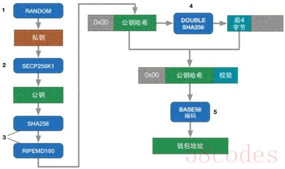 5. 将上一步结果使用BASE58进行编码(比特币定制版本),就得到了『钱包地址』。
