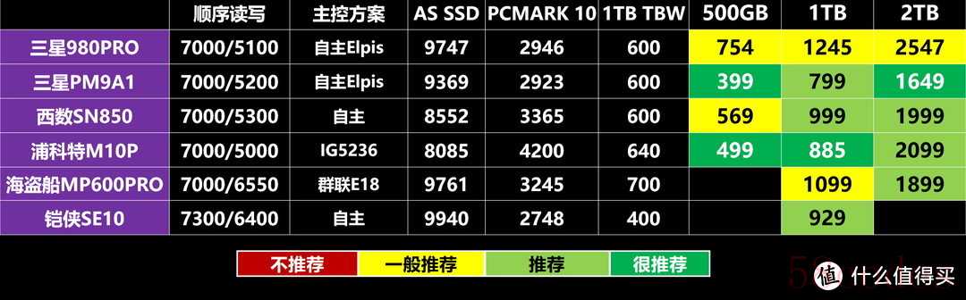 因此我们还是主要推荐如三星、美光、铠侠(和旗下浦科特)、西数和长江存储的产品。海力士在国内基本没零售渠道,英特尔消费级SSD缺乏竞争力,就不在推荐之列。