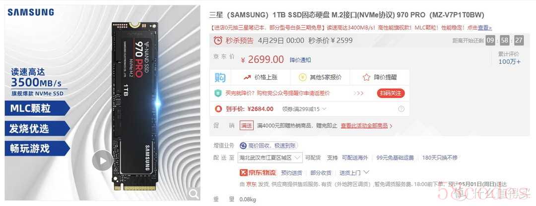 980目前是京东销量第一的SSD,虽然其也是无缓方案,但凭借主控性能的提升,整体性能还是十分接近于老旗舰970 EVO Plus的水平。