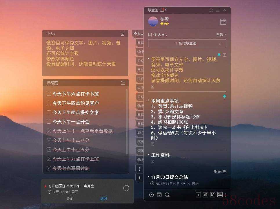 2、敬业签界面可以一直悬挂在桌面上置顶显示或嵌入桌面;支持分类管理便签、待办事项;可以设置日程提醒、周期重复提醒;便签中可以保存图文、视频、音频、文档等电子资料;拥有时间轴日志记录、日历月视图、已完成列表等功能;电脑与安卓、苹果、原生鸿蒙手机实时同步数据!清爽无广告,目前比较专业、好用的便签+待办管理软件!