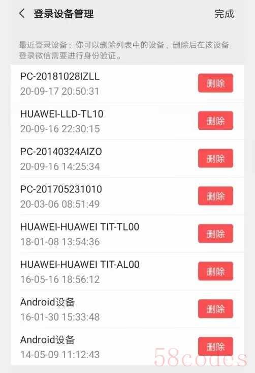 列表里如果出现不认识的设备名称早就淘汰的旧手机,借出去后没管的电脑,直接点击右侧删除按钮。删除后,这些设备再想登录你的微信,必须经过身份验证,相当于给你的微信装了一道智能门锁,不是你本人操作,谁也进不来。