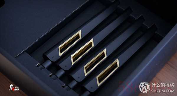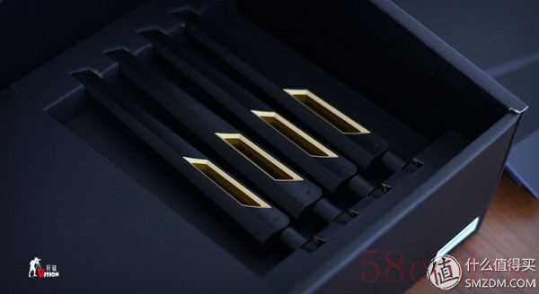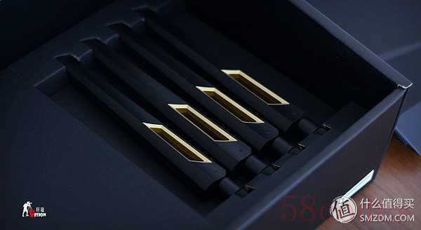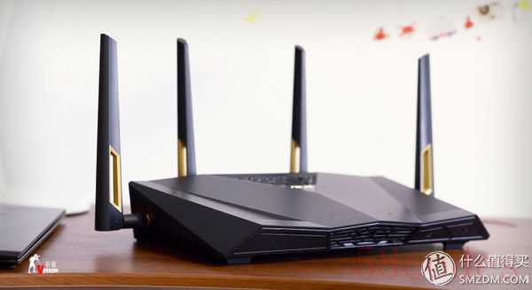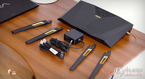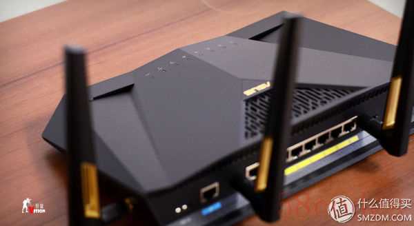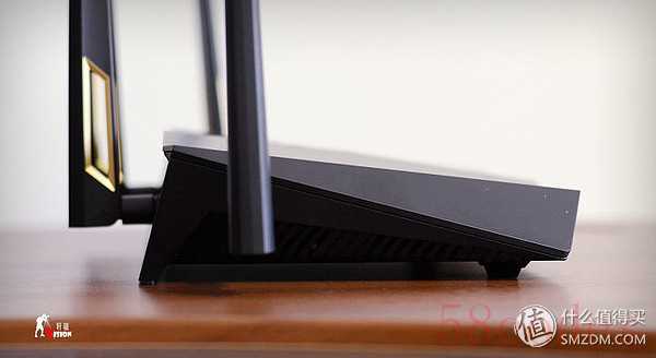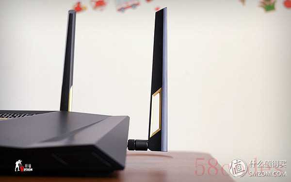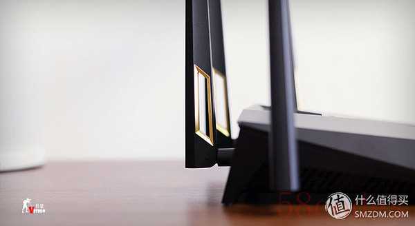 话说回来,华硕RT-AX88U电竞路由的天线造型值得一说,算得上别致,每一根的中间都有个方形的镂空,镂空用金色的涂层贯穿,很醒目。据说这样的天线造型,搭载华硕AiRadar智能雷达定向传输技术、以及RangeBoost 技术,信号强度可以更稳,覆盖范围可以更广。