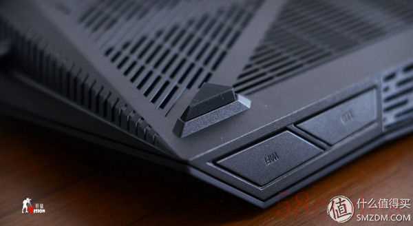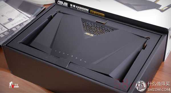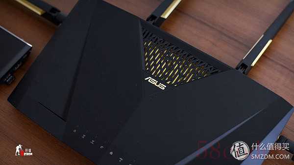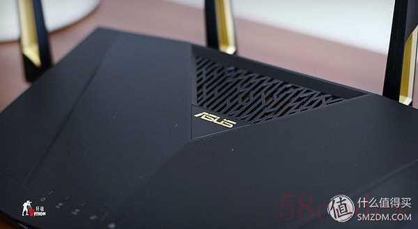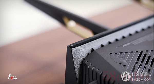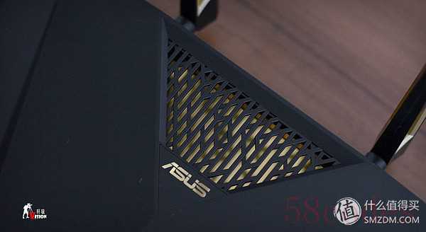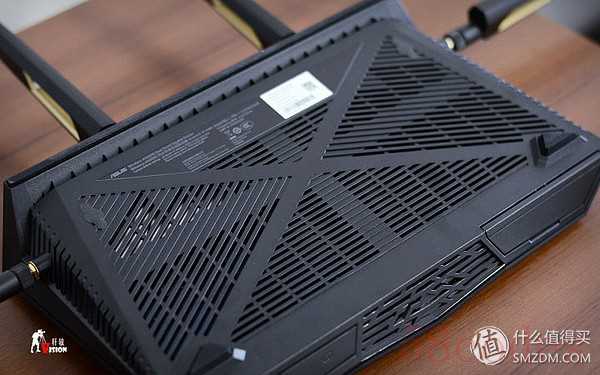ASUS标识上方有三角轮廓的镂空,透过镂空可以看到里面是黄色的金属,猜测是路由器的散热片,不过这么大片的散热片还真比较少见,可见华硕用料厚道,除了保证路由器的高效散热之外,也导致路由器的机身足足有1公斤的重量。