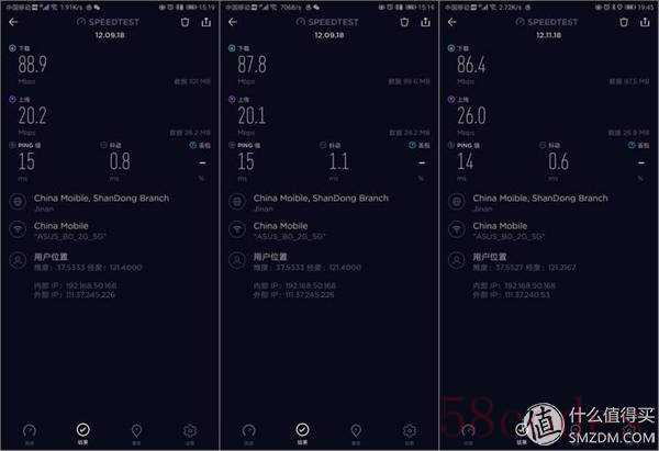 首先使用SPEEDTEST在餐厅、卧室、卫生间等位置进行测试,ping值分别是15ms、15ms、14ms,上传下载速度维持在87Mbps、20Mbps之间,差别不大。