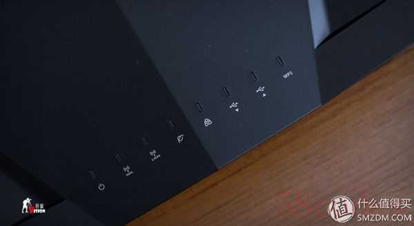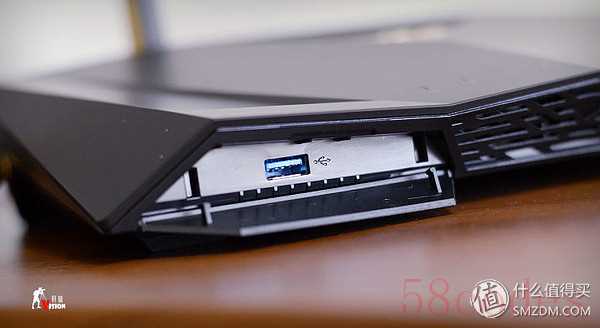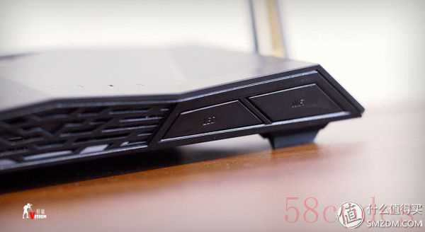 路由器正面也有看点,居中是镂空的格珊,类似于汽车的中网,可以提升散热性能,左侧“大灯”实际上是一个USB接口盖板,右侧“大灯”则是两颗按键。