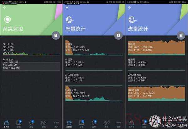 主页面是路由器的控制面板,图形化显示当前路由的在线状态、WiFI网络的状态、以及已连接的设备台数等。中间的圆形很有动感,左右滑动可切换实时流量、客户端连接数量、系统CPU内存占用情况。