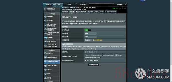 事实上这个不算华硕RT-AX88U电竞路由的新功能,华硕RT-AC86U已支持双WAN,可以把LAN口设置为第二WAN口,这样可以通过交换机进行单线双拨,也可以通过光猫直连单线双拨,前提是你家的光猫支持,不用刷梅林固件也可以玩双拨,还是比较有优越感的。另外LAN5&LAN6支持2Gbps链路聚合功能,适合NAS高速传输。