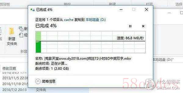 下面结合NAS测试下千兆网络传输性能,NAS是自己DIY的一台小主机+Win7,NAS与笔记本直接通过千兆网线接入路由器,从NAS直接拷贝高清电影文件来测试读写速度,结合实际结果来看,从NAS读写速度大约稳定在85MB/s,基本是满带宽传输,千兆转发性能比较出色。