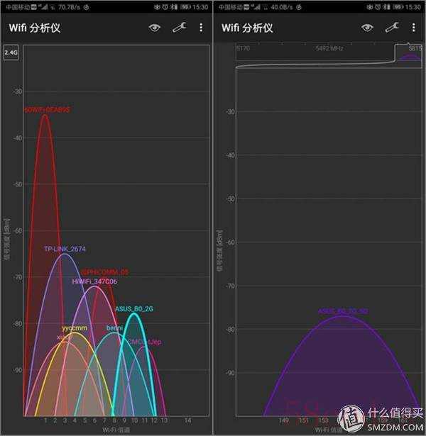 为了更好的测试华硕RT-AX88U电竞路由的无线信号情况,楼主使用使用wifi分析仪,分别在在A点、C点、D点测试2.4G、5G两个频段上的信号质量,取稳定值,测试前将无线状态保持默认出厂状态。由于住宅区的无线信号较多,存在一些不确定的干扰因素,因此测得数据仅供大家参考。