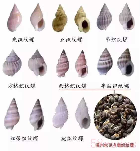 习见织纹螺:体形较小,贝壳呈尖锥形,壳质坚厚,成熟个体壳高12毫米-18毫米,壳宽7毫米-10毫米。壳面螺旋纹和纵肋交叉点处有明显的粒状突起。栖息在潮间带至数十米深的泥沙质海底,到目前为止尚无有毒报道。