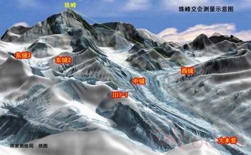 "方法:" 主要使用三角测量法。在距离珠峰较远的地方(如西藏定日或尼泊尔昆布地区)设立观测站,精确测量仪器(如经纬仪)的垂直角和水平角,同时精确测量观测站之间的基线长度(已知距离)。