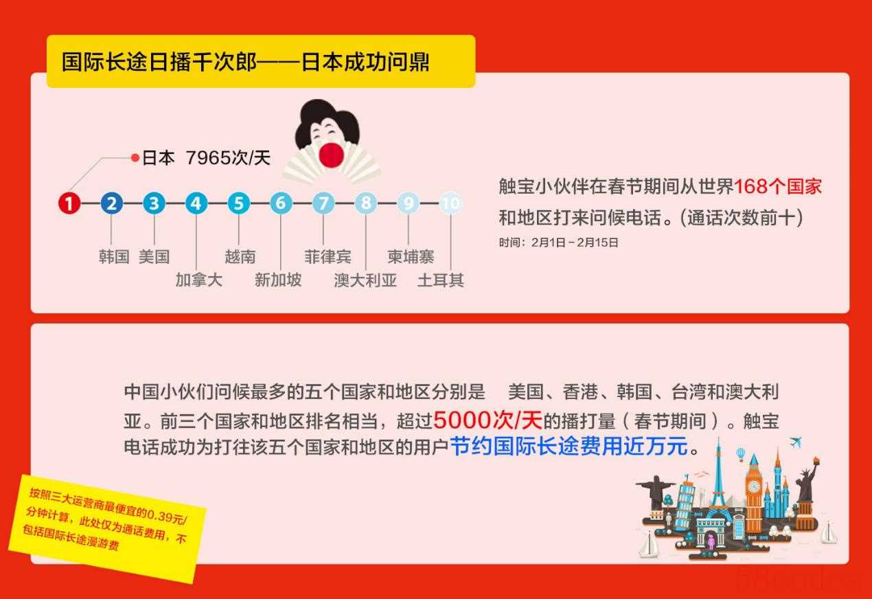 抛开其他因素不谈,只看数据。据了解,春节期间拨往日本的这7000多通电话中,有比较多的用户还不清楚有免费国际长途这种功能,无形中也加大了节日问候的开支。拜年沟通亲情固然重要,缩减开支也利于自己。因此在这里也提醒国内的小伙伴们,虽然春节已经过了,但节约话费不能马虎,以后再拨国际长途时就不用花那么多冤枉钱了,以触宝电话为首的国际长途免费软件正在悄悄兴起,不妨装一个,也可以减少对日本的商业贡献,不做冤大头。