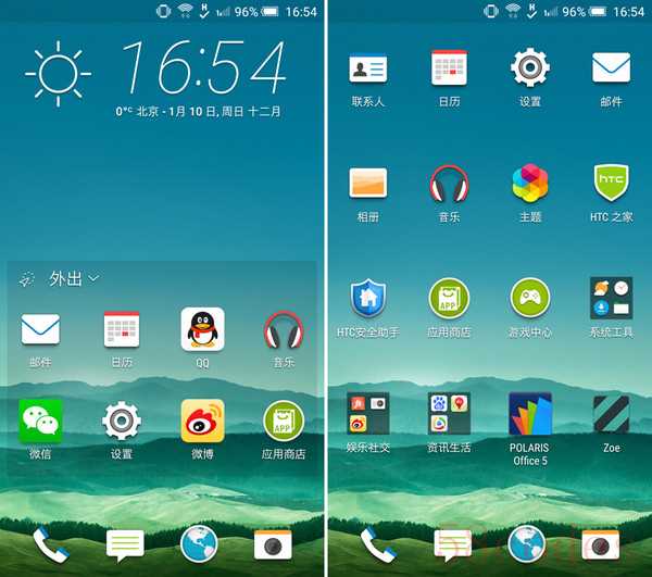 HTC X9搭载的是基于安卓5.0深度订制的HTC Sense 7.0版本的系统,界面与近几个版本HTC Sense的设计差别不太,主要是去除了二级菜单的设计,多后台任务菜单也采用卡片式呈现的风格。相对于其它定制系统,HTC Sense主菜面比较有特色的设计便是可以针对使用场景而对应用分类显示的个性化首页功能,单独的“要闻”资讯菜单页面。个性化首页功能即是可以根据不同的场景,而在主界面首页显示不同的应用。“要闻”资讯界面即是我们可能通过订阅或者关联社交账号后,就可以在该界面查看相关的资讯。另外HTC也和国内软件厂商开展深入合作,提供了不少本地化的功能,如和触宝合的通讯录黄页功能。