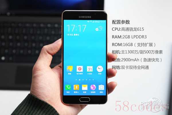 三星Galaxy A5采用一块5.2英寸1080P屏幕,搭载一颗高通骁龙615处理器,采用28nm LP制造工艺,内置8xA53内核,其中4颗主频1.5GHz,另外4颗主频为1.2GHz,GPU为Adreno 405,主频为550MHz。内存方面,A5拥有2GB双通道LPDDR3内存,存储方面为16GB eMMC 5.0 ROM,支持microSD卡扩展。此外,A5内置一块2900mAh电池,系统内置多种省电模式,正常使用一天不成问题。