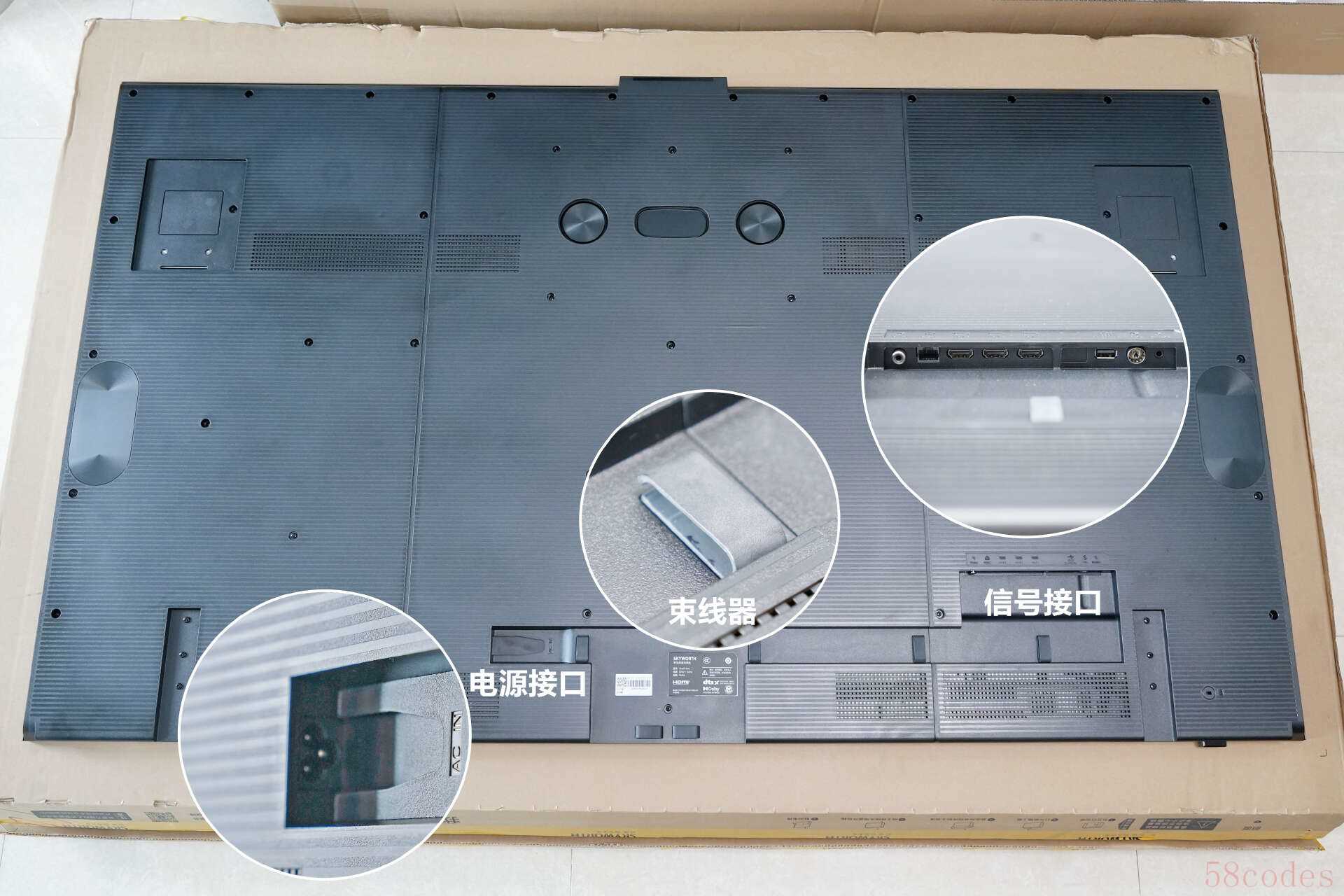 另外还有个细节,不管是电源接口还是信号线接口,导出口都有专门用来走线的凹槽以及束线器,最终导向电视正中间,从底部穿出。