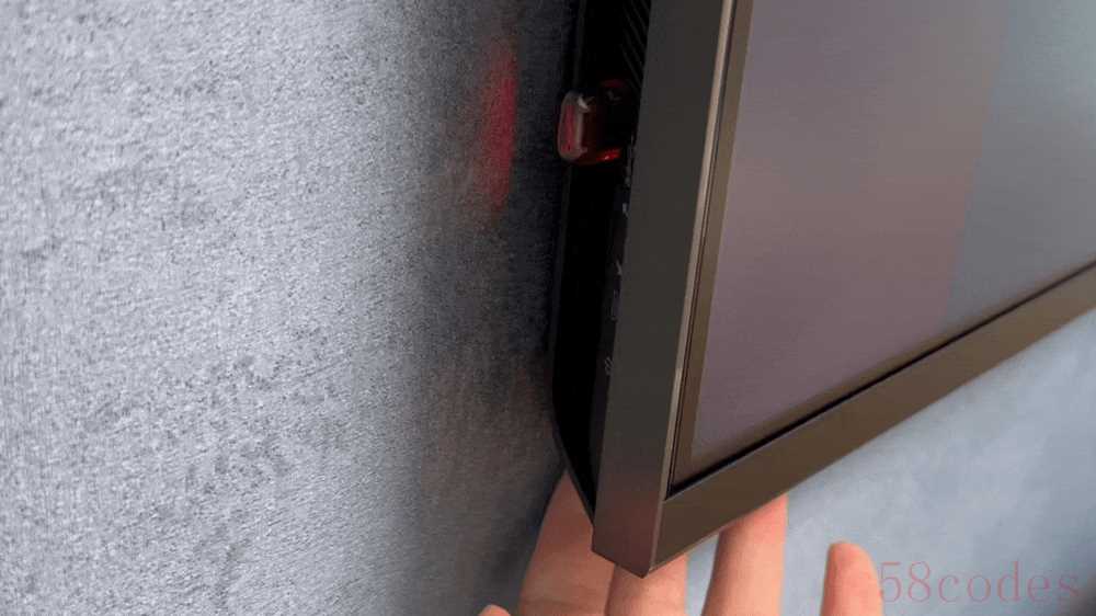 前文展示过,挂架是可以转动的。因此必要时可以从电视底部将电视翻起对接口进行插拔操作,实测单人即可完成,并且可以看清接口位置,无需盲操 ▲