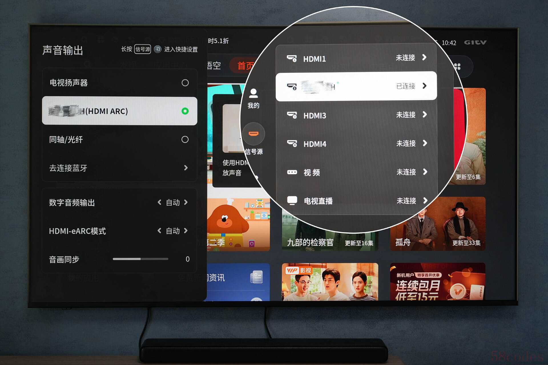 参数和接口介绍中没有提及 HDMI接口是否支持 ARC/eARC输出,不过实测 HDMI2是支持 ARC输出的,不过使用前先要在「声音输出」中江「DHMI-eARRC模式」设置成「自动」(默认关闭)▲