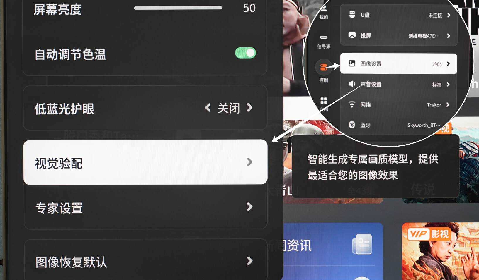 另外电视出厂默认为「标准」模式,大家如果觉得色彩不符合个人喜好,可以在「设置」-「控制」「图像设置」-「视觉验配」目录下对色彩饱和度、对比度以及锐度三个指标进行个性化调校 ▲