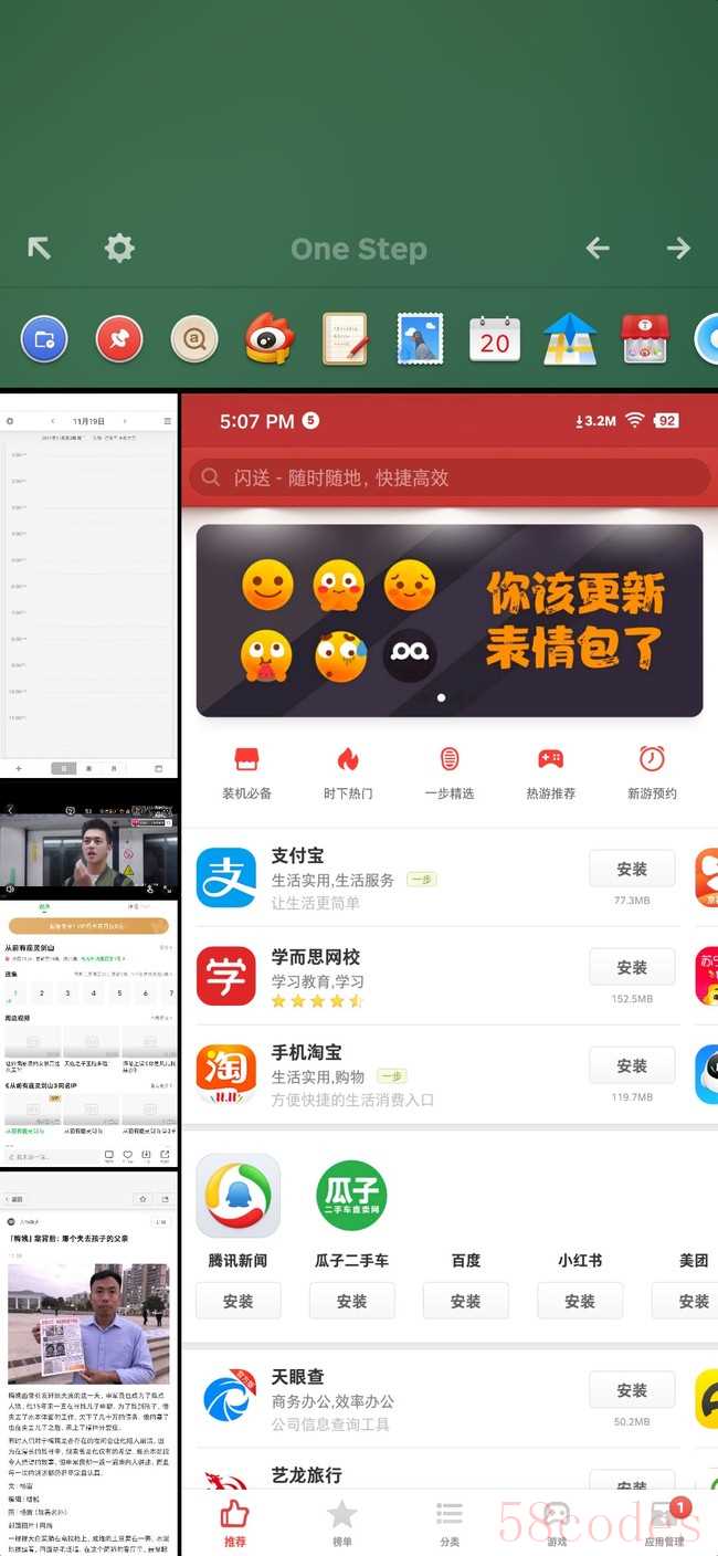 One Step则是坚果 Pro 3搭载的另一项实用功能。它支持同屏显示 4 个活动应用,并支持将图片拖拽至微博这种同屏跨应用操作,你可以将它理解为一个更为强大的分屏操作。但与 One Step相比,分屏操作却是一非常简陋且鸡肋的功能。通过One Step,你可以随心所欲地切换各个应用,而不需要分屏操作那种复杂的选中工作。