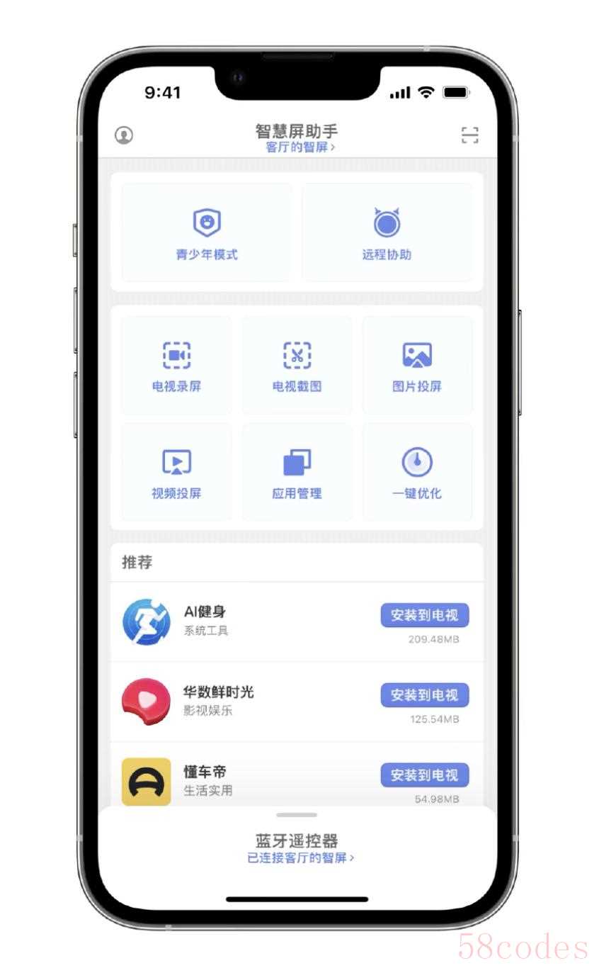 APP首页具有青少年模式、远程协助、电视录屏等功能,也能下载各种电视App。另外手机还能通过蓝牙变身遥控器,有时候遥控器找不到了,可以用手机来应应急。