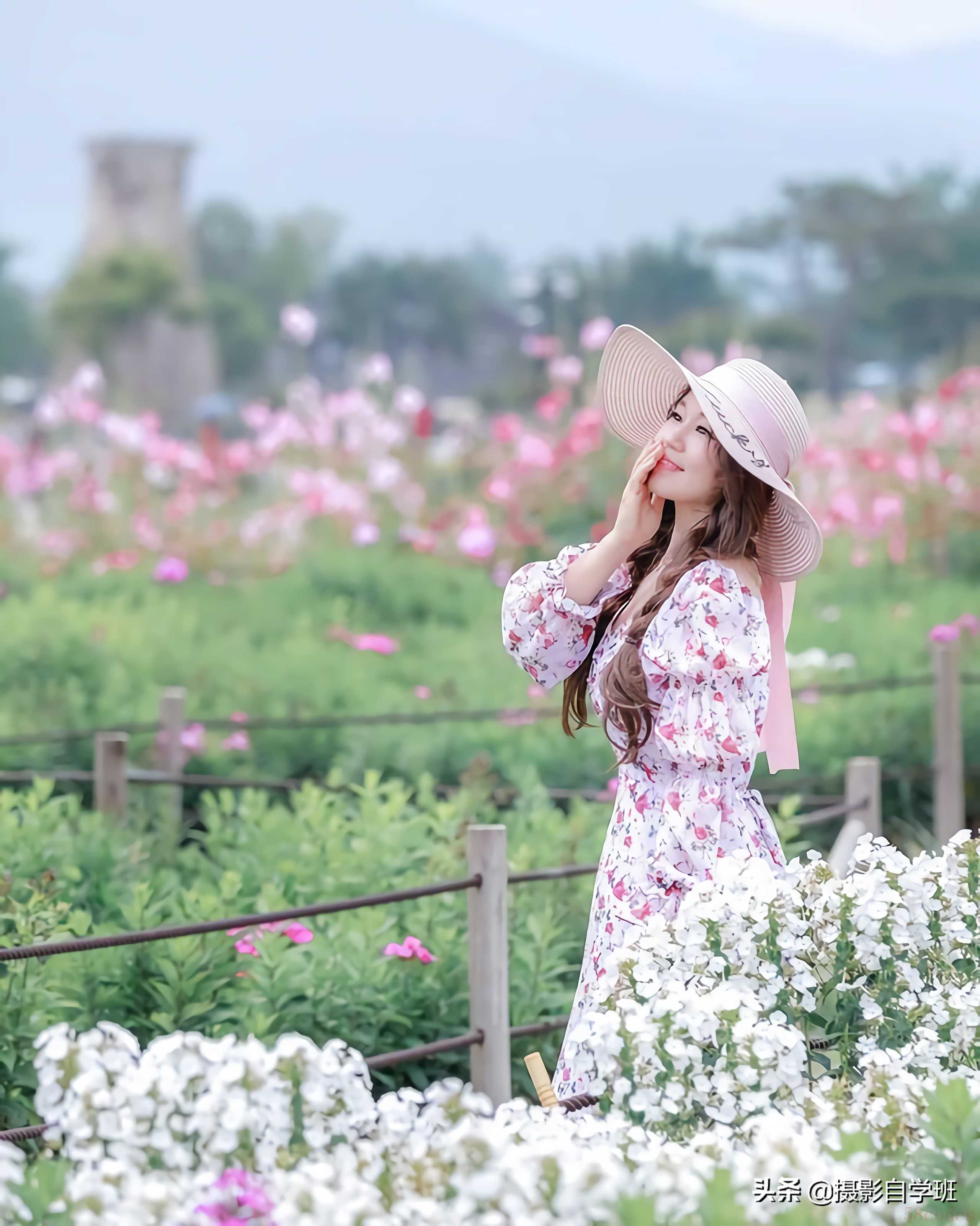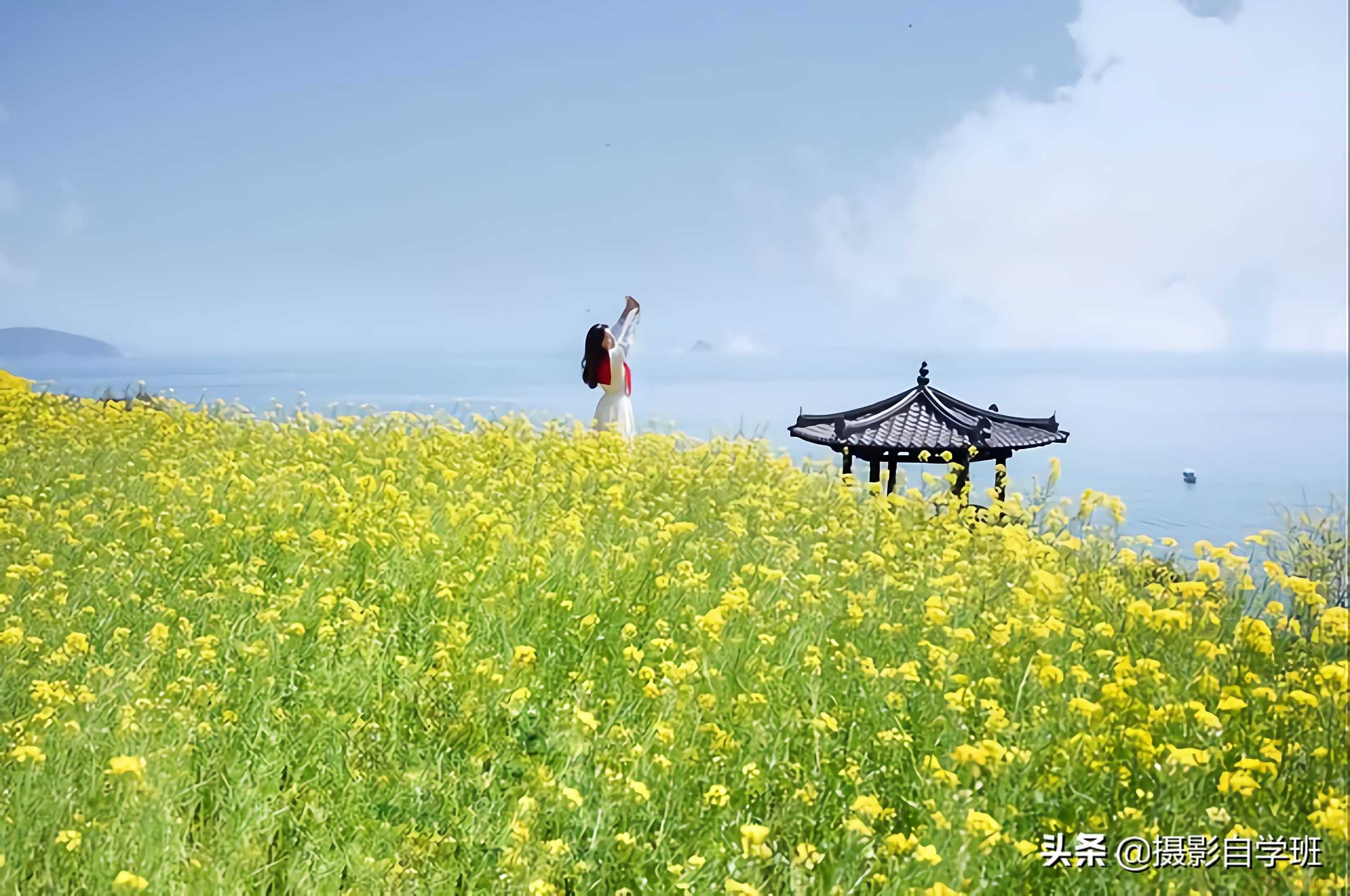还要注意构图,比如上面这张照片,就是正确的例子,摄影师找了一个很好的角度,花海成一个三角,天空与海面成一个三角,三角形的构图,作为整个环境,人在画面中接近黄金节点的位置,整张照片更美观。而下面这张照片。构图上就是一个错误。一个失败的案例,人被背景线穿着头而过,画面前景的花,也很杂乱,远处还有一个凉亭,从形态上,比人大,也很显眼,让照片显得更加乱,这样的照片就不耐看。怎么能更好地进行构图呢?你在拍摄的时候,一定要多尝试一些不常见的角度,不常见的方向,就会拍出不常见的效果。
